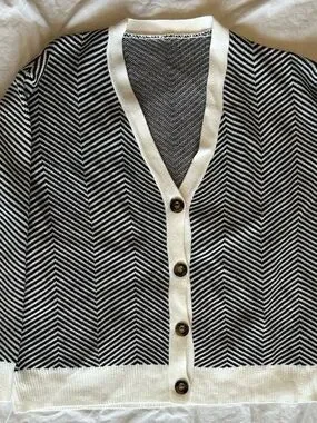 Bold chevron knit in black and white. Contrast white trim and button-front closure. V-neck silhouette for layering. Lightweight, graphic look for daily wear.