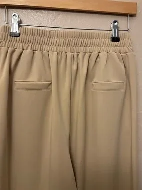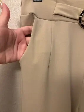 Elegant high-rise wide leg pants in beige with a decorative waist ring. Soft, drapey fabric for all-day comfort. Hidden side pockets for convenience. Versatile neutral beige pairs well with blouses and blazers.