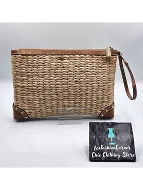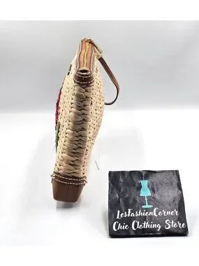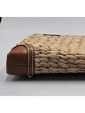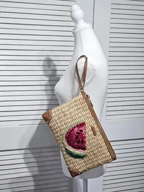 This Michael Kors raffia wristlet combines artisanal charm with functionality. Its embroidered watermelon design adds flair, while leather accents ensure durability. With a zippered top and wrist strap, it’s ideal for carrying essentials while showcasing a playful, summer-ready aesthetic. Perfect for casual outings or adding a tropical touch to your wardrobe.
