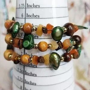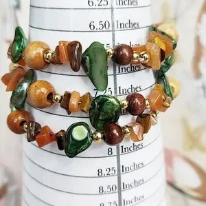 This listing is for a memory wire bracelet made from wood, shell stone chip beads, accented with gold tone spacers. It is in excellent condition. It measures approximately 7 1/4". I have lots of other memory wire bracelets listed in my closet, as shown in the last photo. This listing is only for the bracelet described. I will include a velvet dust bag for storage. Buy with confidence, careful packaging promised. I love to bundle.