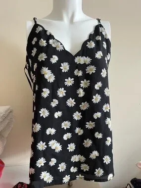 Black cami featuring white daisy-style floral print with yellow centers. Scalloped neckline and thin adjustable straps. Feminine and versatile layering piece.