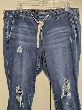 Super comfortable and stylish Torrid distressed denim jeans featuring a relaxed, pull-on fit with a drawstring waist. Perfect blend of comfort and edgy style—great for casual everyday wear.