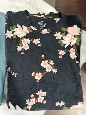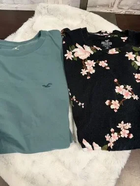Two Hollister short sleeve shirts. One solid teal tee with subtle logo. One black tee with pink floral print. Soft casual style. Easy to pair with jeans or shorts.