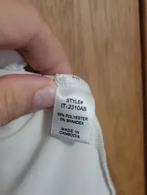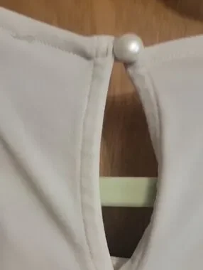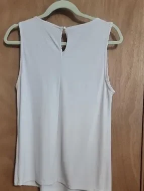 Sleeveless shell top with soft pleats at the neckline. Keyhole button closure at back. Smooth, drapey fabric for an elegant look. Versatile piece for work or casual wear.