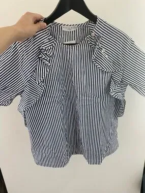 Marshman women's blouse in navy and white vertical stripes. Lightweight fabric with a feminine ruffle trim at the front and short sleeves. Versatile, polished piece that pairs well with trousers or jeans.