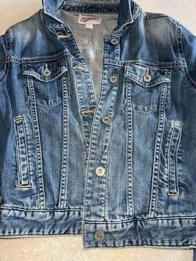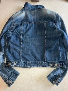 Classic fitted jean jacket with front button closure. Dual chest flap pockets and vertical seam detailing. Slightly faded wash for a worn-in look. Versatile layering piece for casual outfits. There is a light/faded area on the center back. The back is pictured with both flash and no flash to show what it truly looks like