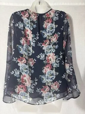 Navy blouse with multicolor floral print. Tie-front neckline for a feminine touch. Light, flowy fabric and soft drape. Versatile for day or evening wear. Fully lined in pre owned excellent condition