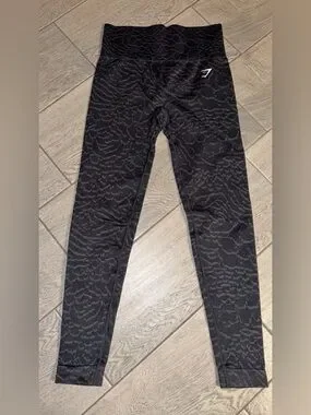Gymshark seamless high-waist leggings with subtle animal texture. Stretchy, body-hugging fit. Sleek black base with gray pattern. Small Gymshark logo at hip.