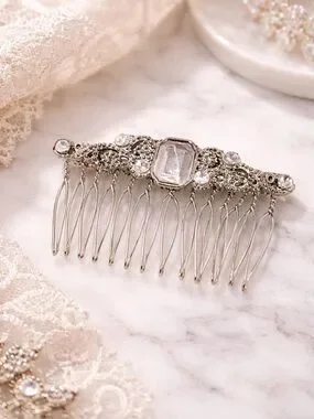 Elegant silver hair comb with clear crystal accents. Adds sparkling detail to wedding and special occasion hairstyles. Lightweight design for comfortable all-day wear. Silver tone complements white and cream ensembles.