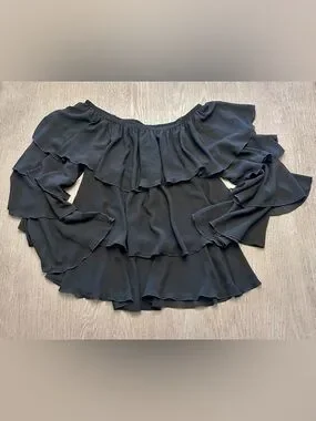 Show Me Your Mumu “Chi Chi Top” in black — a best-selling, feminine off-the-shoulder blouse with dramatic tiered ruffle sleeves and flowy silhouette.