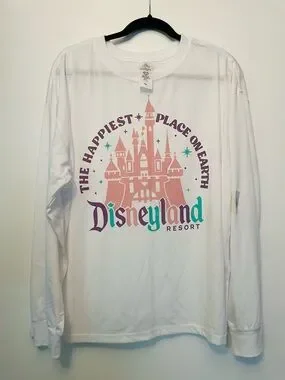 Disney-branded long-sleeve tee. Features a pink castle graphic with teal and purple Disneyland lettering. Lightweight cotton blend for daily wear. Playful park-inspired design.