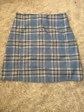 Classic plaid mini skirt in blue and white. Smooth A-line silhouette. Easy to pair with tees or sweaters. Lightweight woven fabric for everyday wear.