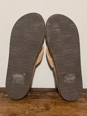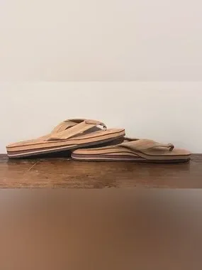 Classic tan nubuck leather thong sandal. Padded strap and contoured footbed for comfort. Durable brown outsole for traction. Subtle branded detail on the strap.