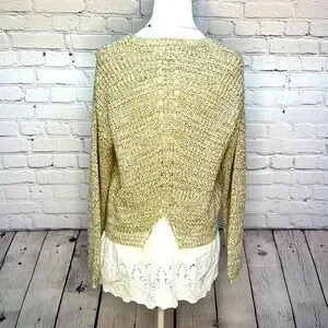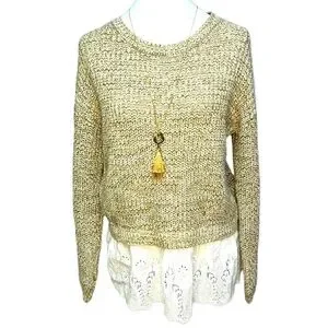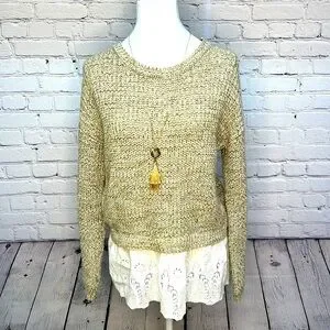 Light tan & tan colored sweater with a cream eyelet ruffled hem