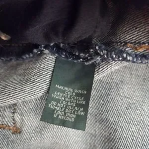 This product is a pair of Ralph Lauren women's plus size 16W straight leg jeans in a high rise dark wash blue. Made from a blend of spandex and cotton denim, these jeans feature a classic 5-pocket design with a zip and button closure. The mid-rise waist is 38 inches, and the inseam is 29 inches. The garment care instructions recommend machine washing. Perfect for all seasons, these jeans have a preppy style.