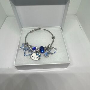 Adorable blue Hello Kitty charm bracelet featuring multiple sparkling charms and beads. Includes heart, butterfly, crystal accents, and enamel Hello Kitty pendant. Set on a sturdy silver-tone cable bangle that adjusts for comfort. Perfect for gifting or adding a cute touch to your outfit!