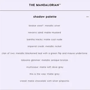 Complete your galactic vanity with The Mandalorian™ Collection including our best-selling The Child™ Palette! This complete set includes the NEW 9-pan The Mandalorian™ Pressed Powder Palette with saturated neutrals and rich earth toned shades in buttery matte, matte with sparkle, and shimmering metallic finishes. Pair with The Child™ Pressed Powder Palette featuring a mix of sages, olives, golds, and neutral tones in a range of finishes from matte and metallic to our iconic Super Shock formula. Complete your The Mandalorian™ haul with 2 shades of our nourishing Lux Lip Oil, a super cute The Child™ Hand Mirror to check out your look on the go, and The Cutest in the Galaxy Makeup Bag for all your galactic beauty essentials!