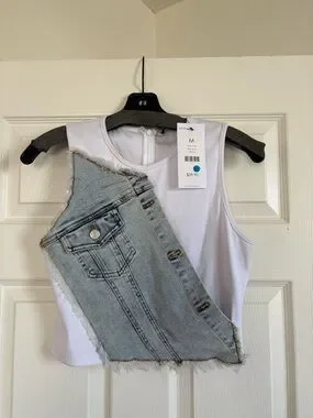 White ribbed crop tank with attached light wash denim vest overlay. Sleeveless design with raw hem denim detail. Trendy layered aesthetic for casual wear.