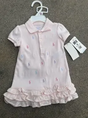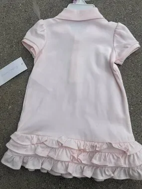 Soft pink knit skirt with ruffle hem and embroidered accents. Features button-front detail and gentle stretch for comfort. Easy-care fabric perfect for everyday wear. Charming pink color adds a sweet, classic look.