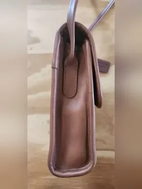 Amazing vintage Coach Scooter Bag in British tan leather with brass hardware. The scooter has one main comparment, a front slip pocket, and turnlock closure. Is in very good vintage condition. Charm not included.