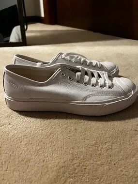 All-white Converse jack purcell low-top sneakers. Canvas upper with classic rubber toe and sole. Lace-up closure for a secure fit. Timeless casual style for everyday wear.