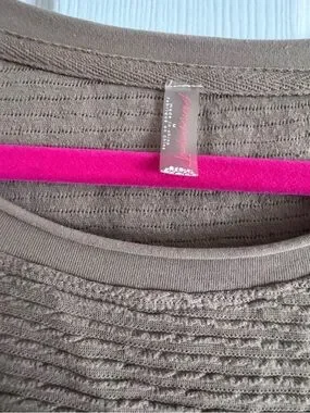 Soft taupe knit with textured horizontal ribs. Crewneck silhouette with subtle neckline trim. Neutral everyday top that layers easily. Looks brown on camera but more of an olive green color.