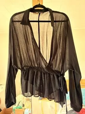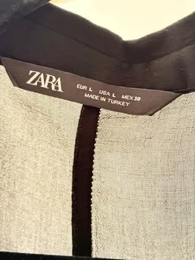 Elegant Zara blouse with contrasting trim. Cream textured front panel with black collar and center trim. Subtle woven fabric for a refined look. Versatile for work or events.