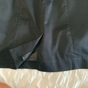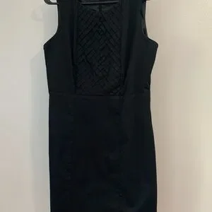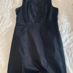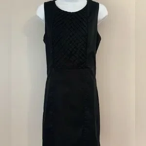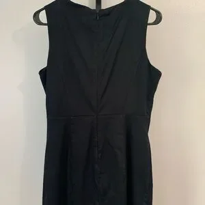 Apt. 9 black sleeveless dress. Size 12 petite has a shell that’s 98% cotton and 2% spandex. The lining is 100% polyester. Dress has hook and closure and zipper down the back. Dress has a nice e lattice detail on the front and a slit on the back.
