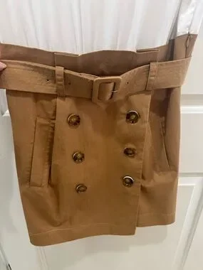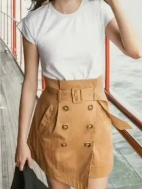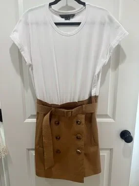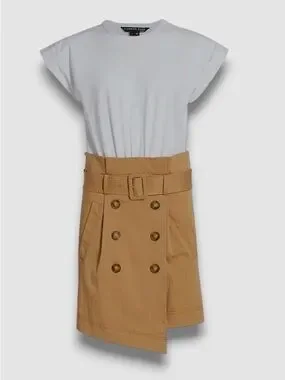 Structured mixed media mini dress with a wide belted waist. Double-breasted button detail at front. Asymmetrical wrap hem for modern edge. Clean, tailored lines for versatile styling.