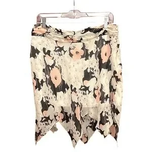Elegant floral skirt from Kenzie, a delightful addition to any wardrobe. This eye-catching mini skirt features an all-over floral pattern in ivory, pink, and black. It showcases a unique handkerchief hem that creates a flattering, asymmetrical silhouette. With a comfortable, ruched waistband that ensures a flexible fit, this 100% silk skirt is ideal for parties, date nights, or dressing up for brunch.