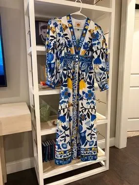 New with tags, Farm Rio bold floral maxi dress with puff sleeves. V-neck with decorative trim. Blue and yellow print on white base. Feminine and eye-catching.