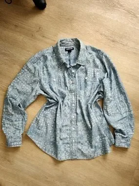 Lands End Denim Shirt L Petite Paisley Bandana Print Oversized Western Boho