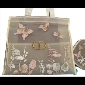 This item is a Christian Dior Beauty embroidered butterfly and dragonfly tote bag. The Christian Dior Large Tote Mesh Bag is a luxurious and stylish accessory designed for women. This brand new tote bag is perfect for everyday use or special occasions, showcasing the sophistication and elegance that Dior is known for. With its large size and mesh design, this bag offers both fashion and functionality, making it a must-have addition to any fashion-forward woman's collection.
