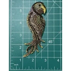 Style: Parrot brooch with sweeping long tail feathers, textured feather detail and stylized bird silhouette