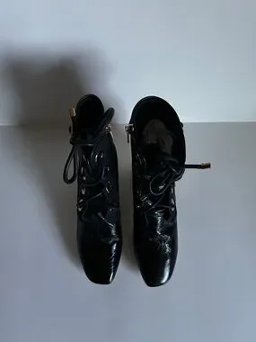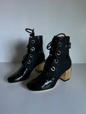 Dior Black Lace-Up Ankle Boots with Gold Ribbed Block Heel