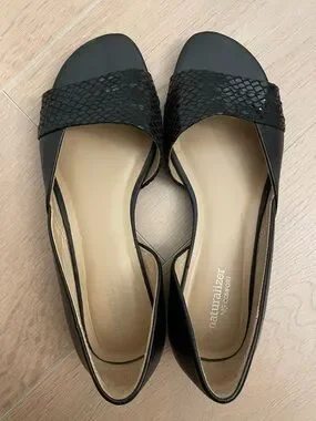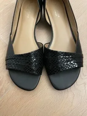 Sleek black open-toe D'Orsay flats with textured snake-print strap. Lightweight and versatile for everyday wear. Cushioned insole provides comfortable all-day support. Classic black pairs easily with dresses and casual outfits.