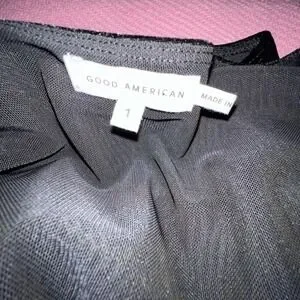 Good American black velvet bodysuit crafted with a plush, shimmering texture and a sleek thong-style back. This sleeveless piece features a classic scoop neckline and a snap-button gusset for easy wear. The form-fitting silhouette provides a smooth, tucked-in look that pairs effortlessly with high-waisted denim or skirts for a sophisticated evening ensemble. The interior is lined with a breathable mesh for added comfort and structure.
