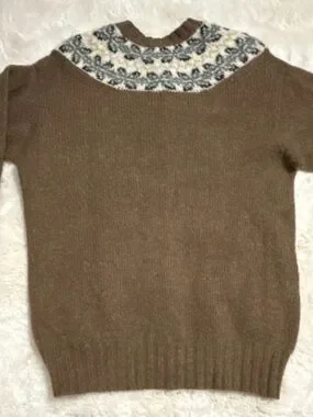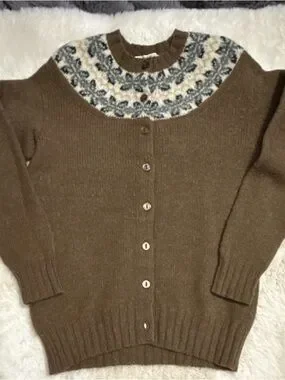 Brown knit cardigan with a patterned cream and blue yoke. Button-front closure and ribbed cuffs and hem for a neat fit. Cozy, versatile sweater perfect for layering in cooler weather.