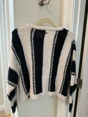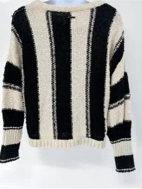 Chunky knit sweater with bold vertical stripes. Crew neckline style with relaxed, slouchy fit. Textured fabric for everyday layering.