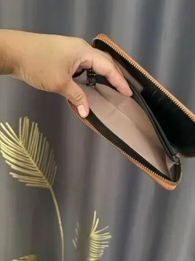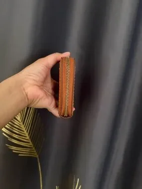 Pebbled leather exterior with full zip closure. Gold-tone Marc Jacobs logo and hardware. Multiple card slots and compartments inside. Classic cognac color for versatile wear.