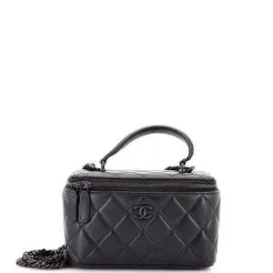 Elevate your style with the Chanel So Black Top Handle Vanity Case. Crafted from luxurious quilted lambskin, this small-sized case exudes sophistication and elegance. The sleek black design is accentuated by the iconic chain handle, adding a touch of glamour to any outfit.