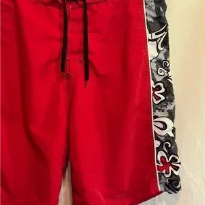 RS Surf Red with Gray & White Floral Side seam, Mesh Lined, Summer, Swim, Board Shorts. Single back pocket. Drawstring at front middle waist. Casual & comfy. Lightweight. Soft. No stretch. 100% polyester material. Gently used with no stains or flaws.