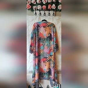 Vibrant kimono with a tropical print. Features a mix of colors including pink, orange, and green. Perfect for layering.
