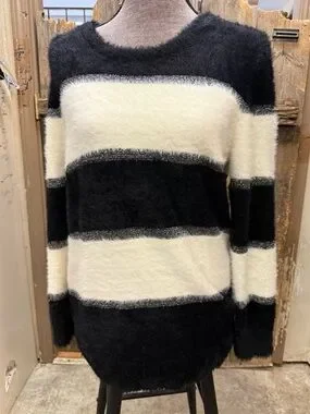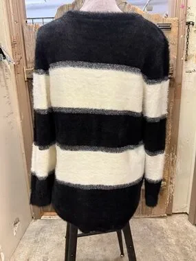 Soft fuzzy knit sweater with bold horizontal black and cream stripes. Classic crew neckline and relaxed silhouette. Lightweight and cozy for layering. Versatile wardrobe staple with textured finish.