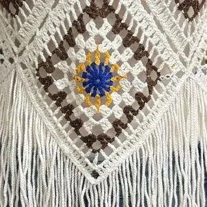This sweater features a series of classic crochet granny squares arranged in a diamond patchwork layout and flared long sleeves along with a fringe hem front.
