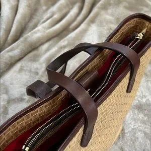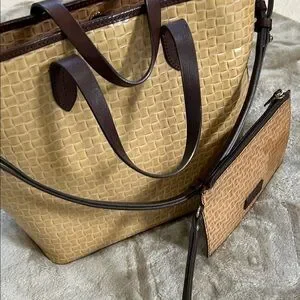 Dooney & Bourke woven tote. Tan body with dark brown leather trim and handles. Detachable matching pouch included. Structured silhouette with subtle branded logo. Classic, versatile style for everyday use. Only use one time. Absolutely beautiful bag!