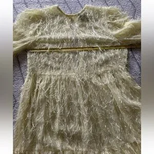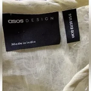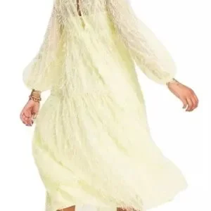 This ASOS Design women's tiered midi dress in fluffy texture is a stunning piece in pale yellow, featuring long balloon sleeves and a mock neck neckline with a button closure. Perfect for weddings or parties, this fit & flare dress is lined and falls to a midi length. The dress has a bohemian and colorful theme, with layered accents adding to its unique style. Ideal for summer, fall, or spring, this A-line dress is sure to make a statement at any event.