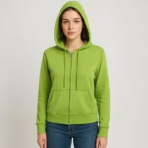 Bright lime green hoodie with front pockets. Comfortable and casual style.