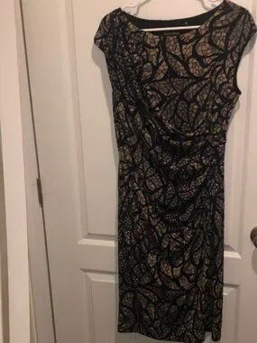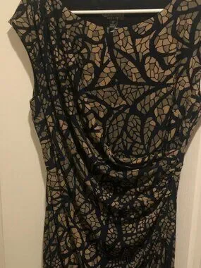 Fitted midi sheath with short cap sleeves. Draped front detail creates a flattering silhouette. All-over tan leaf pattern on a black base. Smooth, stretchy fabric for easy wear. Versatile piece for office or events.