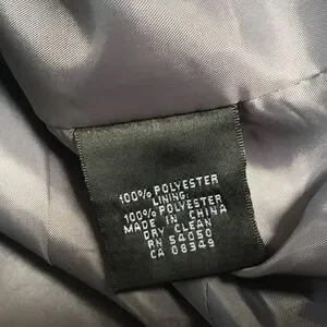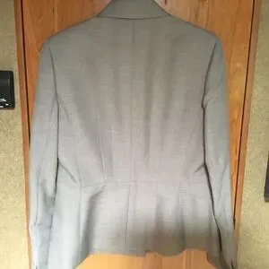 New without tags. Kasper Brand Women’s size 6 jacket in dove grey. V-notched collar, long sleeves with slit cuffs, two front breasted button closure, faux pockets (non-working). Beautiful tucking detail on front and back sides can be seen when you zoom in. Fully lined. Showing photos of front and back sides along with fiber contents and care information.